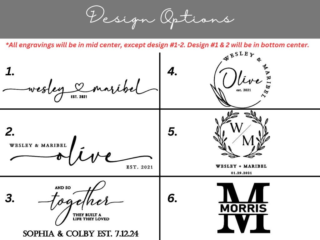 Don't forget to choose your preferred design from the Option Design Page displayed in the listing pictures. When purchasing coasters, be sure to specify your design choice. If no design option is provided for the coasters, it will be assumed that you prefer the same font for both the board and coasters.